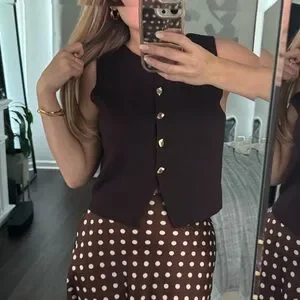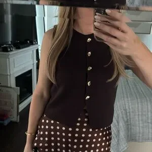 Stylish brown sleeveless top featuring elegant gold buttons. Perfect for any occasion.