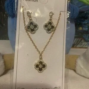 Elegant gold and black clover jewelry set featuring a necklace and matching earrings. Perfect for adding a touch of sophistication to any outfit.