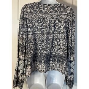 The Lucky Brand Blue White Geometric Long Sleeve Soft Top in XL is a stylish and versatile blouse perfect for casual occasions or travel. Made from a comfortable cotton blend material, it features a round neck, pullover closure, and colorful geometric pattern. The top has a regular fit and is machine washable, making it easy to care for. With its long sleeves and casual style, it is a great addition to any woman's wardrobe, especially for the summer, fall, or spring seasons. festival, tribal, boho,