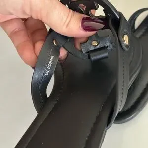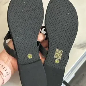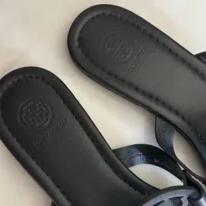 Elegant black sandals with signature cutout Tory Burch logo. Ideal for everyday style.