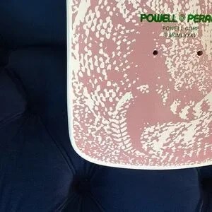 Pink skateboard deck featuring a skull and snake design. Powell Peralta branding.