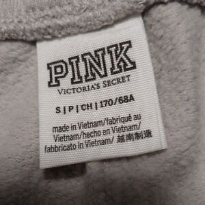 Soft gray fabric with PINK Victoria's Secret branding. Ideal for everyday comfort. light minor staining on left leg at bottom.