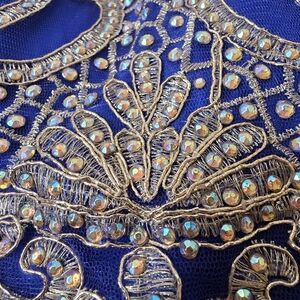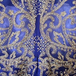 This stunning kids dress features a vibrant blue color with intricate gold detailing, perfect for special occasions. The elegant design ensures your child stands out with style and grace.