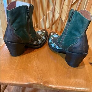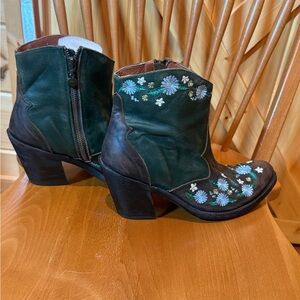 Step out in style with these Dan Post embroidered leather ankle boots in brown & deep blueish green. Featuring beautifully embroidered flowers, these boots are perfect for any occasion. These boots show slight wear, but still gorgeous. #rodeo #concert #Swiftie #festival #cowgirlaesthetic #coastalcowgirl
