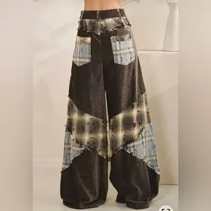 unique patchwork, plaid, and animal print wide-leg pants. Features a blend of brown, blue, and cream tones. Cotton 70%, polyester 25%, and spandex 5%. Small waist flat 14”-17” stretched. Rise 12”. Inseam 29.6”. Medium waist flat 15.5-18.5”. Rise 22”. Inseam 29.5”. Large waist flat 16”-19” stretched. Rise 12.5”. Inseam 30”. Xl waist flat 17.5”-20.5” stretched. Rise 13”. Inseam 30”.