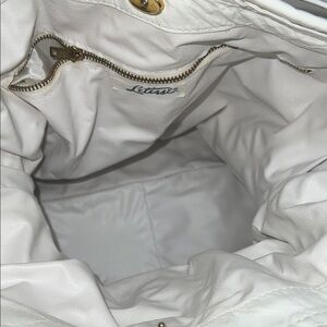 Letisse , stylish white leather shoulder bag with unique strap design.inside zipper pocket, gold tone details, 9 1/2 inches drop strap. Snap closure. Measurements 12 inches by 13 inches . Very clean inside and out!