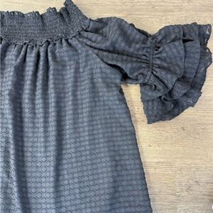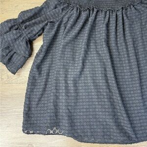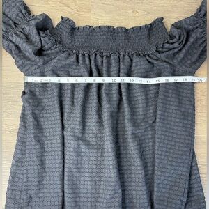 Cece Women’s Black Off the Shoulder Ruffle Blouse with Puff Sleeves, size M. In great used condition. See pictures for measurements and fabric content.