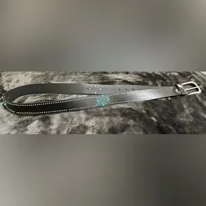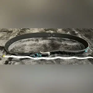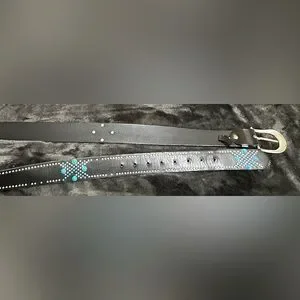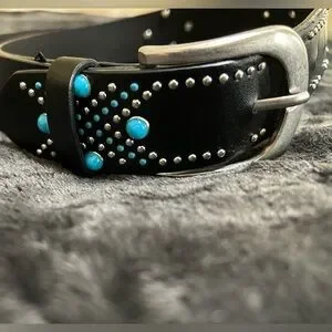 Stylish black belt with blue stud accents. Silver buckle adds elegance. Perfect for any outfit.