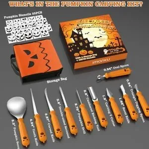 The Imarku Halloween pumpkin carving set contains 10 PCS Carving Tools, 25 PCS Pumpkin Stencils, 1 PC Portable Storage Bag. The storage bag can also be used to hold any tools you want, such as wood carving knives, etc. You will create a unique Halloween artwork with this practical pumpkin carving tool set.