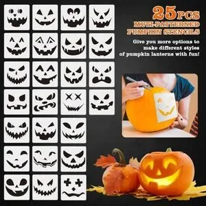 The 25 PCS pumpkin carving stencils included in the pumpkin carving kit to create a variety of scary or funny facial features and patterns, enjoy a happy Halloween with family and friends, and spend a more impressive and memorable traditional festival.