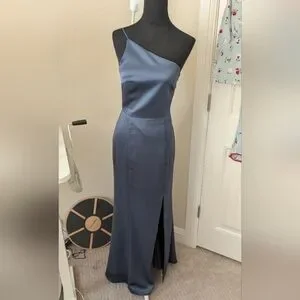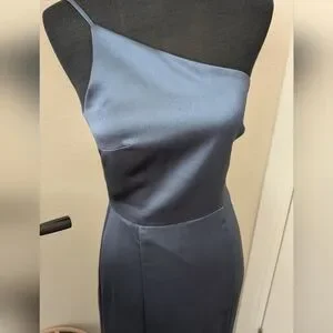 This elegant navy/slate blue one-shoulder dress is perfect for any formal occasion. Its sleek design and rich color make it a standout piece in any wardrobe.