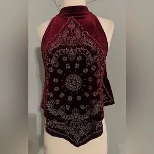 Gorgeous Free People Bandana Bling Velvet Tank in a deep red wine hue. Soft, luxe velvet with intricate bandana-style embroidery gives it that effortless boho-meets-rocker vibe. Features a flattering high neckline, button closure at the back, and a pointed bandana hem that drapes beautifully.