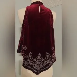 Free People Bandana Bling Velvet Tank XS — rich red velvet, boho embroidery, high neck & bandana hem. Luxe statement piece for festival or night out.