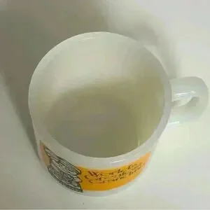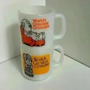 Set of 2 vintage Glasbake milk glass coffee mugs for grandma and grandpa. These kitschy mugs are from 1980. World’s Best Grandpa is in excellent condition with no chips, cracks or paint wear. Worlds best Grandma does have some paint damage (see pic) and a lot of wear to the interior finish. These would be a great addition to to a milk glass mug collection with their bright yellow and orange.