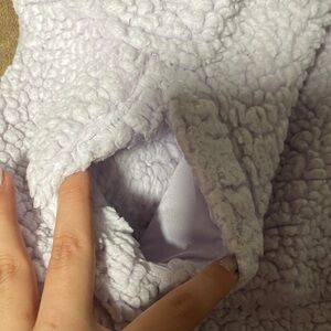 Cozy sherpa jacket. Soft lavender color. Half-zip design. Front pocket detail. Used and does show signs of wear. Zipper works perfectly and no noticeable stain.