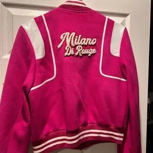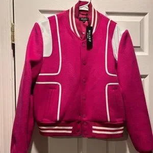 Chic Milano varsity jacket in bold fuchsia and white. Features a sleek button-up front.