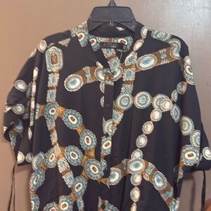 Airy crepe and a tiered skirt elevate the effortless appeal of Lauren Ralph Lauren's plus size shirtdress, which is designed with a unique self-extended waist tie. A Southwestern-inspired belt print updates it for the season.