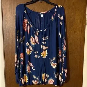 Super comfy! Chic navy blouse with colorful floral print. Long sleeves and flowy fit.