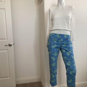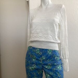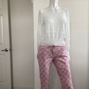 This Banana Republic women’s sweater has a beautiful crochet pattern of zigzag lines, horizontal lines, and small open circles. This sweater is a size small, has long sleeves, crew neck, and is gathered at the waist. It is versatile, and can easily transition from workday to an evening out. Its pullover style eliminates the hassle zippers and buttons sometimes cause.