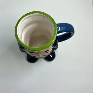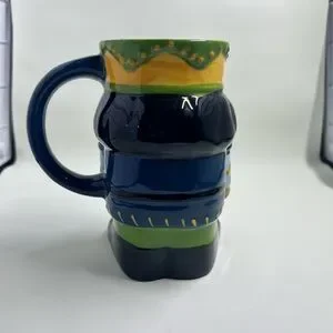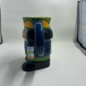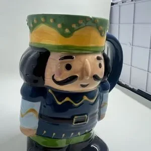 Delightful ceramic mug featuring a festive nutcracker character. Accented with blue and green colors.