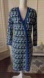 Chic geometric sweater dress featuring a bold blue, green, and white chain-link pattern. Double-breasted front with gold-tone buttons and contrast trim for a polished, modern look. Perfect for work or stylish outings.