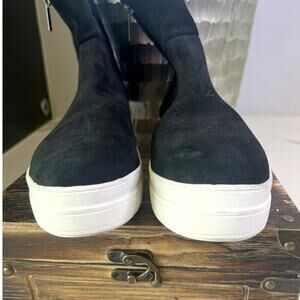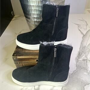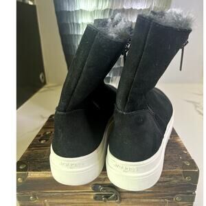 These NWOB J/Slides Tristan Faux Fur Lined Waterproof Sneaker Boots can be turned up and down to expose the super soft plush fur and have the comfort of a sneaker with the warmth and waterproof benefits of a boot. They feature a cushioned footbed, a removable insole, a platform heel, and a waterproof suede exterior with plush faux fur lining. There are some markings from storage, otherwise, they are in great condition.