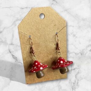 Adorable red mushroom earrings, These charming accessories add a playful touch to any outfit. Made with 14k gold plated ear hardware and silicone earring backs handmade with polymer clay and resin sealed hand painted