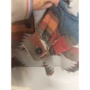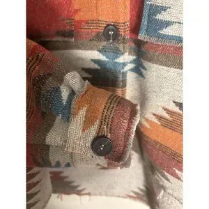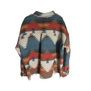 This High Low jacket evokes the spirit of the Southwest with its vibrant, geometric patterns in earthy tones. Designed as a cropped, relaxed fit, it showcases fine attention to detail with frayed edges and functional pockets. Perfect for layering over casual outfits, this piece combines both style and utility effortlessly.
