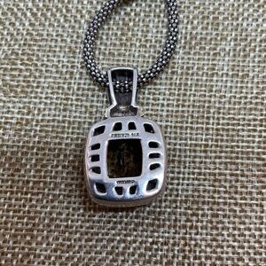 Beautiful necklace, with a multifaceted 6 carat (measures 12mm x 14mm) citrine stone surrounded by diamonds. Sterling silver with two solid 14k yellow gold cables around the neck of the pendant. The pendant is marked 14k and 925, and measures 1 5/16" x 3/4". The chain is marked 925 and is approximately 20 inches long.