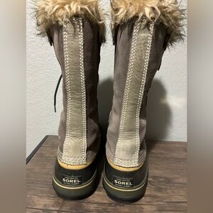Sorel boots with faux fur. Joan of Arc Sorel snow boots size 11. Great condition and one maybe three times or so as you can tell from the bottoms of the boots these are perfect for winter outdoor fun. roomy for thick socks also waterproof and insulated. stay warm and dry Sorel boots, women's boots, snow boots, winter outdoor, designer boots.