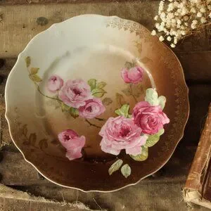 Beautiful vintage / antique collectible plate, dated between 1875 to 1935. Roses in shades of pink and creamy white and greens against an ombre brown background with gold details round the rim. Scalloped edge. The plate measures just about 9.5" in diameter. Marked on the bottom with CT and the eagle mark of Carl Tielsch, Altwasser.