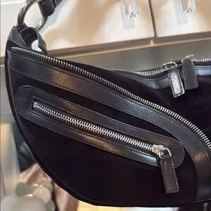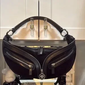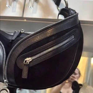This Authentic Versace black Hobo Suede, 90's style is perfect to create a vintage, edgy and chic look. Made from luxurious black suede and leather trim and has piping all way around. It is detailed with multiple silver zippers to give it a bold look.