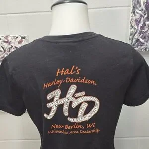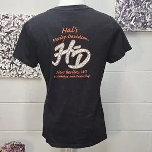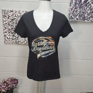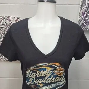 Stylish black V-neck tee featuring a striking Harley-Davidson graphic. Ideal for everyday wear.