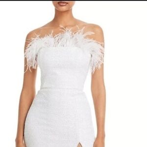 This Amanda Uprichard x Bloomingdale's strapless dress features feather trim and shimmer embellishments. It is fully lined with a back zip closure and a left side front slit.