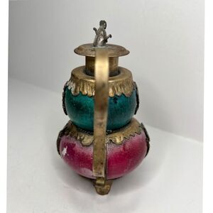 Stunning double-gourd shaped decorative teapot featuring intricate metalwork with dragon motifs. The piece combines turquoise and pink enamel or glass sections with ornate trim. Perfect as a unique display piece for Asian-inspired decor, collector's item, or conversation starter in any room.