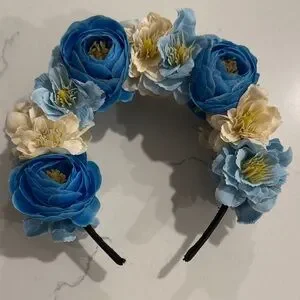 Beautiful headband with blue and cream flowers. Perfect for adding a touch of elegance.