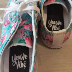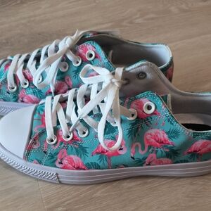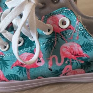 These vibrant women's sneakers feature a playful flamingo print on a turquoise background. Perfect for adding a splash of color to any outfit. Comfortable size 9. Only tried on; never worn outside. New without box.
