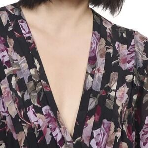 The Kooples English Roses midi dress in black with a vibrant floral print. This dress features a flattering V-neckline, long balloon sleeves, and a cinched waist for a defined silhouette. The skirt flows into a midi length, creating an elegant and feminine look.