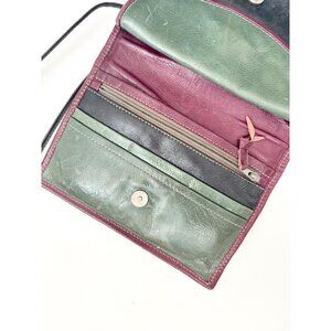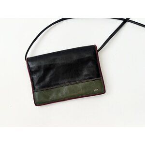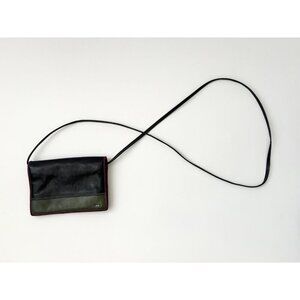 Gorgeous Burba brand genuine leather purse with a long strap. This item was purchased in Rome, Italy. I bought it myself. This piece is vintage and has three colors with various pockets on the inside. Would fit most cell phones, a few keys and a small wallet (there are plenty of pockets for cards and cash in case you don't want to carry a wallet. .In fact, you don't even need one with this bag). Gorgeous and minimal. This bag can honestly serve as a wallet and a regular purse, no need for a wallet. The strap is not adjustable but a good tailor can shorten it in you want to.