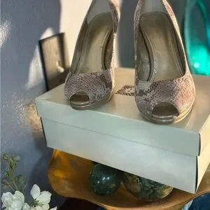 Elegant peep toe heels with a stylish snake print. Perfect for any occasion.