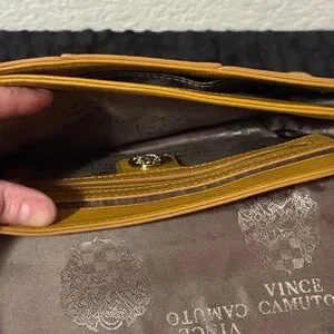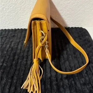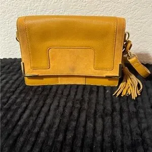 Vince Camuto | Stylish leather and suede shoulder bag has a sleek design. Features a vibrant yellow color with tan interior. Includes a tassel detail and gold accents. This bag is perfect for any occasion. Retail $328 |NWOT