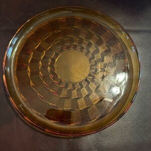 Vintage amber cubic lunch plate. A scratch in the center area, otherwise no chips. Has a curled up edge.