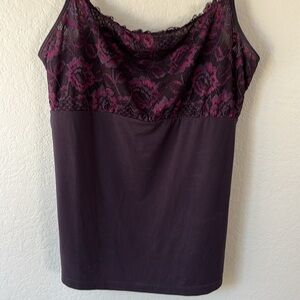 Stylish tank top featuring a black base with purple lace detailing. Perfect for a chic look. Rock it alone as a cute sexy cami. Throw on a cute sweater or blazer or wrap or scarf and go have fun!! Size L. Has lots of stretch, nice length also.