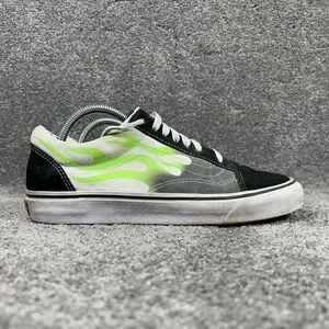 The Vans Old Skool Flames Men's Size 9.5 Black White Green Athletic Skate Shoes are a stylish and comfortable choice for men who enjoy skateboarding or other athletic activities. These lace-up shoes feature a low-top design with a canvas upper material in a classic black color with colorful flames. They are perfect for casual wear or activewear in the summer, fall, or spring seasons. Made by the popular brand Vans, these shoes are a trendy option for those looking for a blend of classic and colorful style in their footwear.