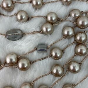 Copper pearl and crystal multi-strand layered necklace by Gardenia Jewelry. Multiple strands of shiny metallic bronze silk thread with shiny copper glass pearls and smokey crystals.