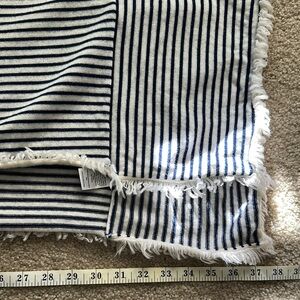 Stylish poncho top with cream and navy stripes. Features fringe detailing for a chic look.