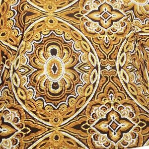 This pretty piece features an eye-catching medallion print in brown, black, golden yellow, and white. It is designed with super-wide sleeves and a keyhole back detail. It offers 3/4-sleeves and is made from polyester and spandex.