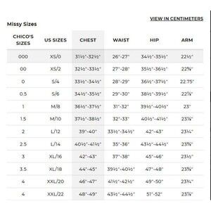 Top is a Chico's size 0 (equivalent to women's US 4 / Small), measuring approximately 23 1/2 inches long (shoulder to hem), and about 19 inches across the bust (armpit to armpit, when flat and relaxed).