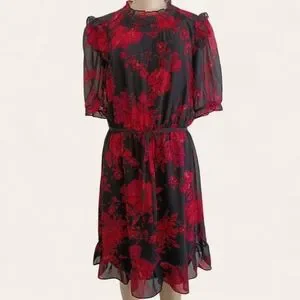 Chic midi dress with striking red floral design. Features a black base and ruffled sleeves. Ideal for stylish outings.