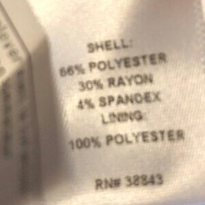 Shell: 66% Polyester, 30% Rayon, 4% Spandex